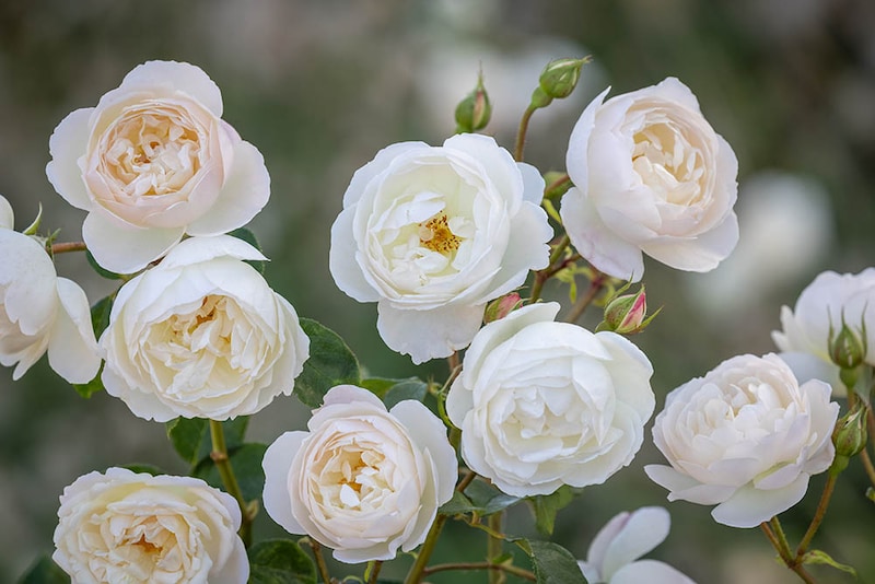 イングリッシュローズの‘デスデモーナ’は、シェイクスピアの戯曲『オセロ』のヒロインにちなんで名付けられました。ピンクのつぼみから、開くと内側はピンクがかった白、外側は純白のロゼット咲きになります。ミルラ香を基調に、アーモンドにキュウリとレモンピールのほのかな香りが混じります。強健で耐病性に優れ、鉢植えにも適したコンパクトな樹形です。四季咲き性もよく、春から秋まで繰り返し花を咲かせ、初心者にも育てやすい品種です。
