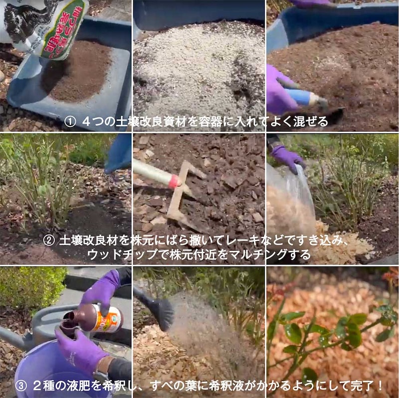 バラの株張り(枝の先端がある位置)と同範囲の表土に、4種の資材を混ぜてばら撒き、表土5~10cm程度を掘り起こしながら資材をすき込みます。次に、株元付近にウッドチップを敷いてマルチングをし、仕上げに2種の液肥を希釈した水を葉にかかるようにあたえるだけの短時間で、夏バテしたバラの回復をスタートすることができます。表土を掘り起こしているとき、根が多少切れても全体量のたった5%程度ですから心配は無用です。