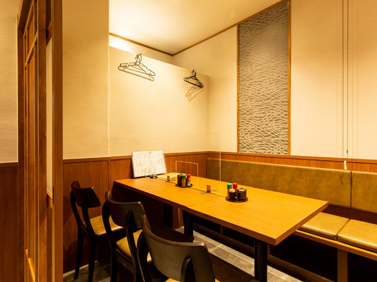 駅近とは思えないほど、ほっと落ち着けるアットホームな店内。広々とした明るい空間に、テーブル席やカウンター席が用意されています。プライベートな時間を大切にしたいなら、上品な設えのテーブル個室がオススメ。4名・6名用の2部屋があり、つなげて最大10名までの利用が可能です。和食に合わせた日本酒も厳選の品揃え、大人の付き合いにふさわしい一軒です。