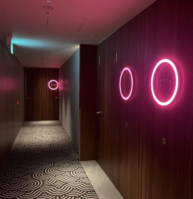 W階の「LIVING ROOM」は、多くの人々が行き交い、新しいカルチャーが生まれる場所。真っ赤なDJブースや漫才ステージのようなインテリアが、エネルギッシュな大阪の文化を身近に感じることができます。ゲストルームへと続く通路にもネオンライト。多彩なゲストルームにも遊び心がそこかしこに取り入れられていて、ちょっとしたカルチャーショックを受けることは必至。そこにいるだけで、不思議とワクワク、ドキドキとした高揚感に満たされます。