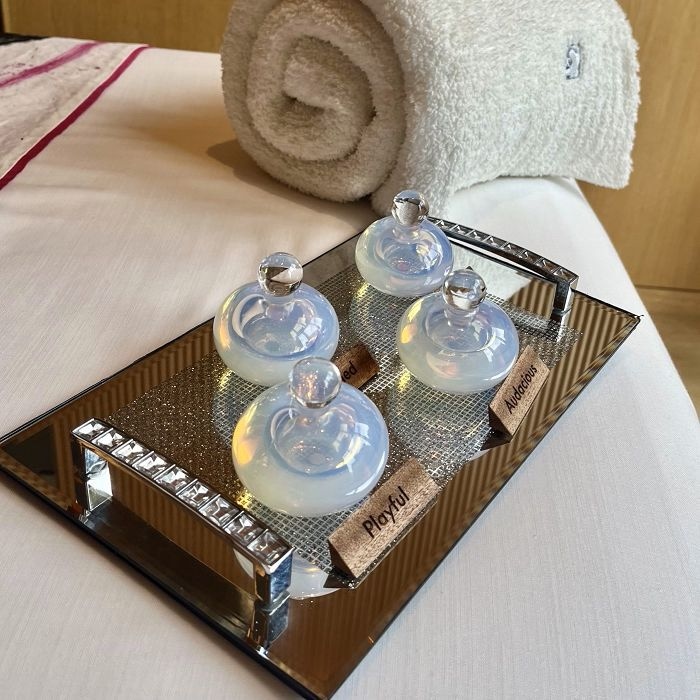 トリートメントルームに移動し、まず受けるフットバスには、大阪府堺市にある蔵元「利休蔵」の日本酒「千利休」と金粉をシェーカーで振り混ぜてイン。これは、各ゲストルームにも常備されているシェーカーを用い、ゲスト自身が自由にカクテルを作ることを楽しもう、という「Wホテル」共通のカクテルカルチャーに倣ったものです。使用するトリートメントオイルの香りはW Philosophyである、Playful(遊び心のある)やAudocious(大胆な)など、4つの中からその日の気分や体調で選べます。一般的なスパが、鎮静やリラックス目的のオイルを取りそろえていることを考えると実に自由でユニークです。