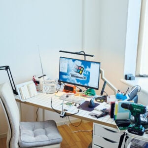 机上にはデスクトップパソコンのほか、工具、絵の具、自作の木製玩具、オブジェなど、一見、執筆のための道具とは思えないようなものも。