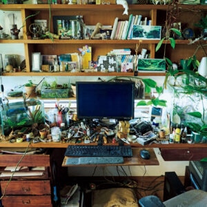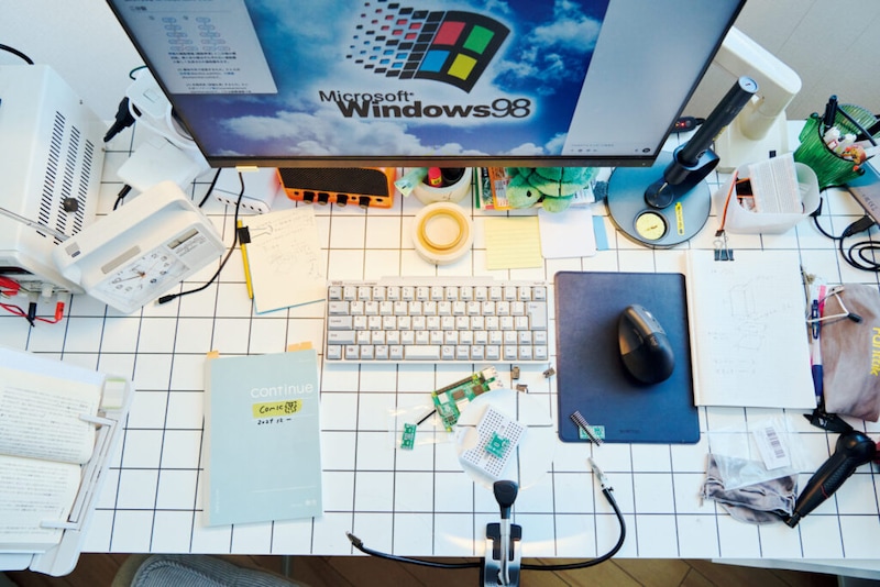 パソコン、電子辞書、読みかけの文庫本、ノートにメモ帳、ぬいぐるみ。ラジオ、アンプ内蔵スピーカー。さらには卓上ルーペ、安定化電源に超小型コンピュータ。種々雑多なものが置かれているこの机の持ち主は、藤原麻里菜さん。「オンライン飲み会緊急脱出マシーン」や「怒ると勝手にひっくり返るちゃぶ台」をはじめ、“無駄づくり”と称してさまざまな工作を手がける発明家だ。仕事環境を自宅に持ってきて以降、生活は規則正しく、ルーティンに支えられるように。