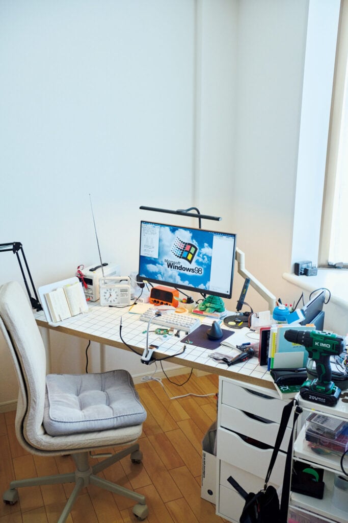 「以前は机に向かって頑張って考えていたのですが、今は普通に生活しているなかで思いつくことが増えました。そのアイデアを実現する方法を、ここで調べて学び、ここで手を動かしながら制作します」