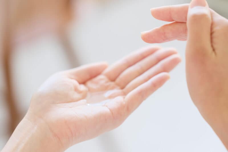 まず、肌につける適量の半分の量を手のひらに取り、顔全体になじませる。