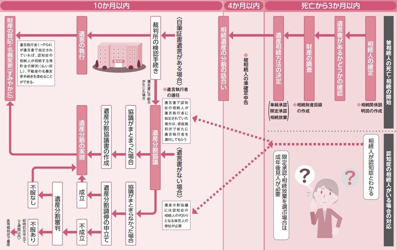 相続が発生すると、まず遺言書のある・なしを確認し、あれば遺言書に従って相続財産の配分を行います。しかし、遺言書のない場合、相続人の中に認知症の人がいると、その配分は簡単ではありません。ここでは相続の大まかな流れをお見せしましょう。
