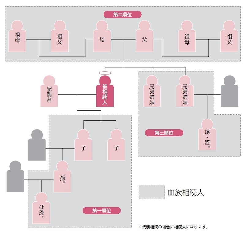 血族相続人は第一順位から第三順位まであり、遺産を受け継げる順位が設けられています。第一順位は被相続人の子ども・孫である直系卑属、第二順位は両親や祖父母という直系尊属、第三順位は兄弟姉妹となっています。順位が上の相続人がいる場合は、下の順位の人は相続人にはなれません。