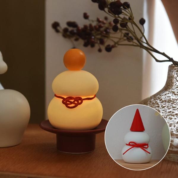 付属の橙と帽子、飾り紐の組み合わせ次第で、雪だるまにも鏡餅にもなるお飾りです。LEDライトが内蔵されているので、間接照明としても楽しめます。