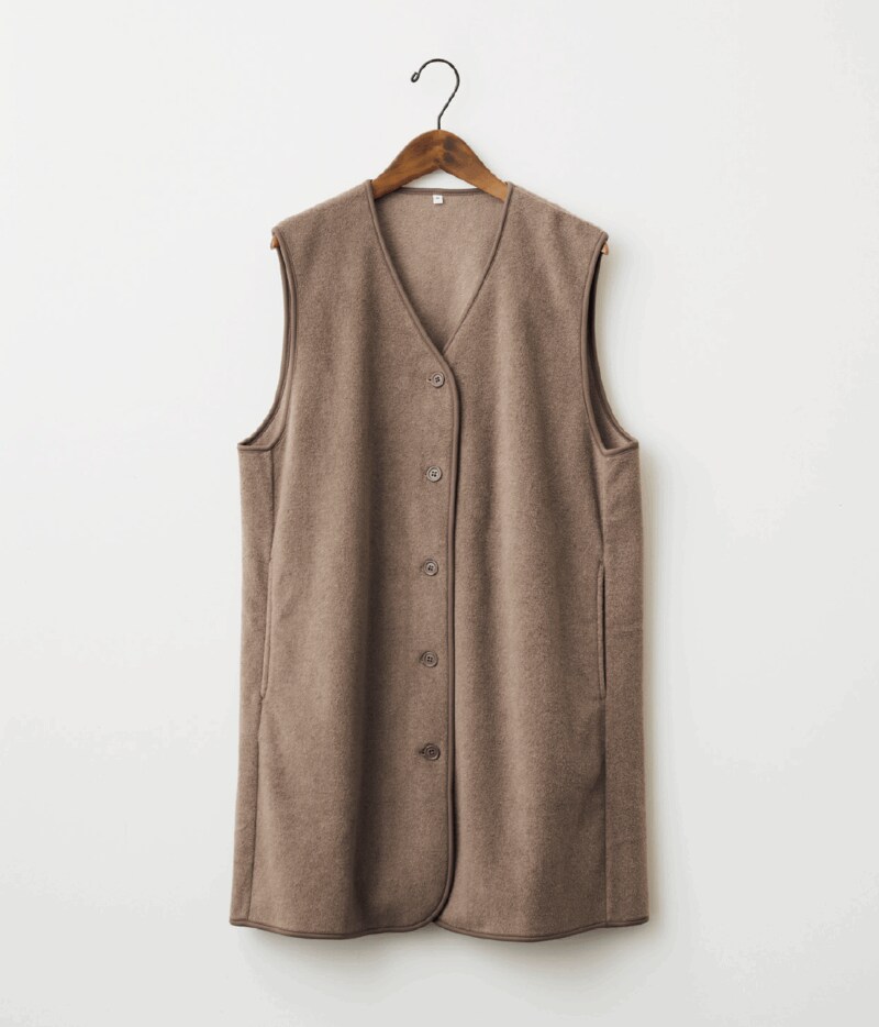 再資源化しやすいよう、生地やボタンなどを単一素材で作ったフリースシリーズに、ロングベストが登場。