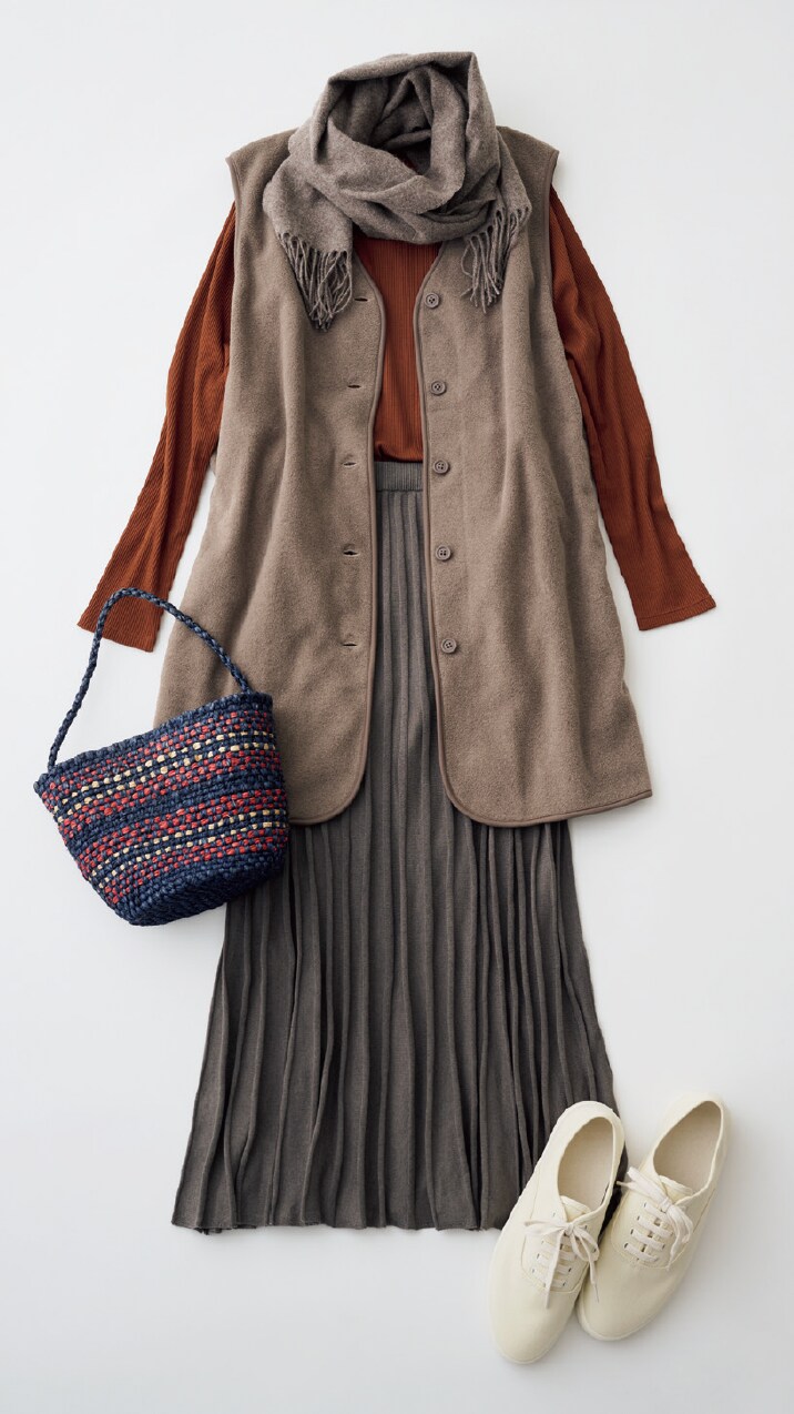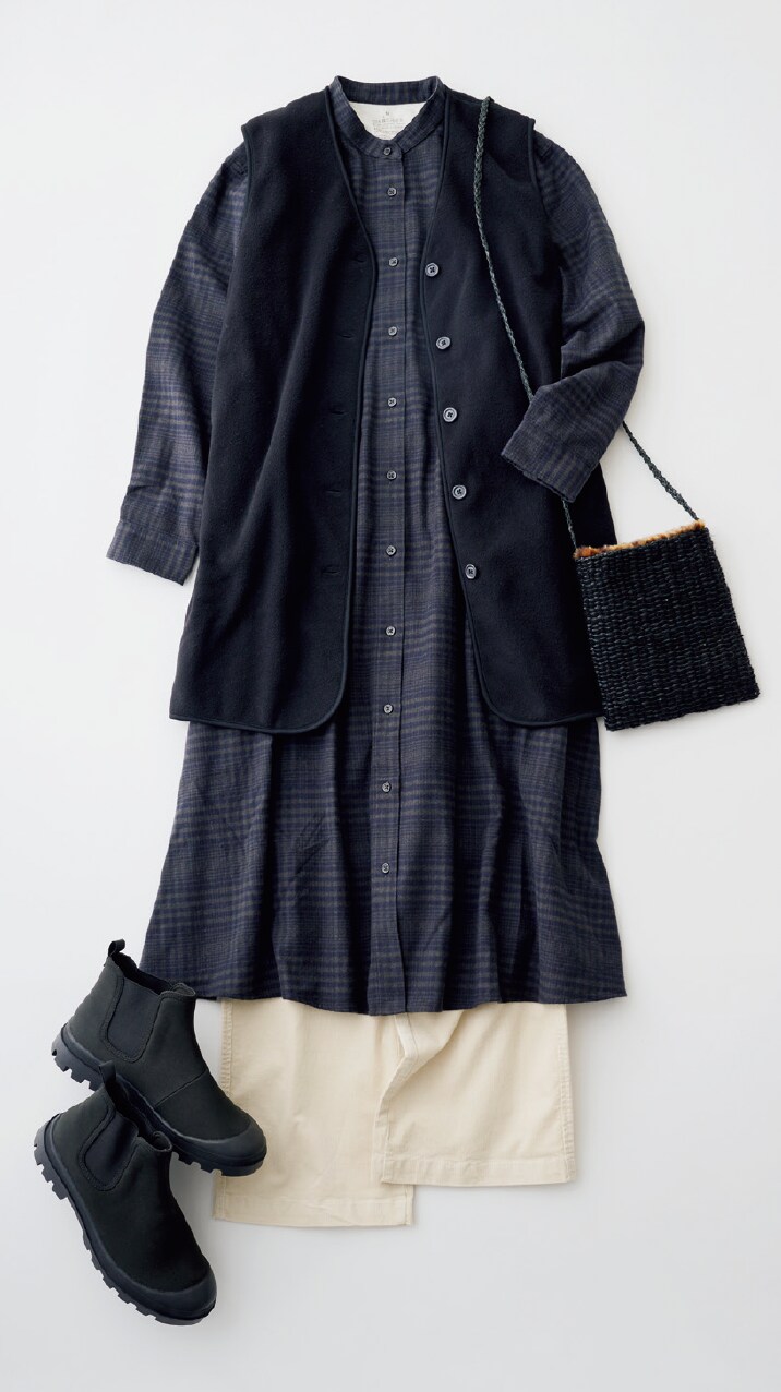重ね着をバランスよく見せたいなら、2(ベストの丈):1(ベストから見えるボトム丈)を目安にコーディネートを組んでみてください。肌寒い季節の防寒とおしゃれ、ともに叶えられる1 着です」