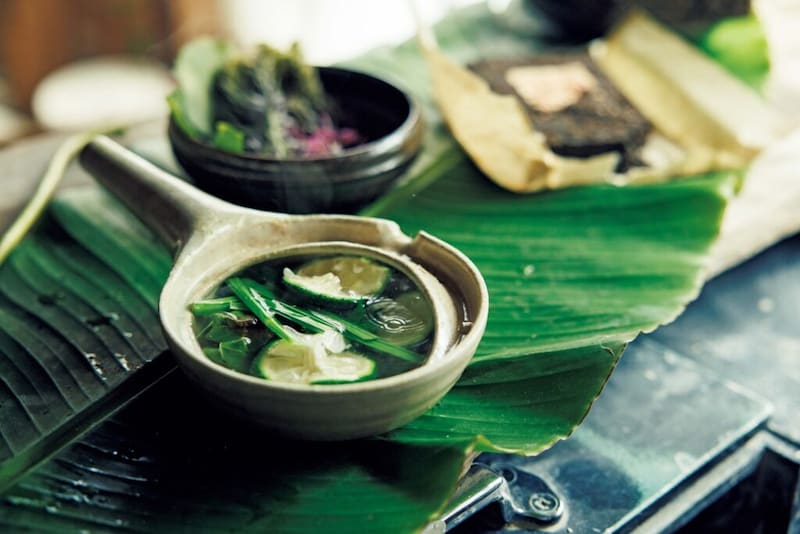 自ら育てた芭蕉の葉を切り敷けば現れる茶席は、葉のみずみずしい青さからも、もてなしの心が伝わってくる。若葉のような香りを持つカキドオシは、イチジクの葉や青柚子、レモングラスなどと合わせて、市川さんが〝植物のスープ〞と呼ぶ茶外茶に。炉にかけた煮茶器の中で、少しずつ変化する味わいや見た目も楽しむ。甘い香りの葛の花は、呼応し合う香りを持つ熟プーアル茶と合わせる。菓子には「見た目がそっくりでしょう」と、生の棗の実とブドウを取り合わせ、遊び心を添える。自然の恵みと即興性に満ちた茶は、まさに一期一会。市川さんにしか生み出せないものなのだ。「こんな茶や飲み方もあるという、気づきをもたらせたら。そのためには、やっぱり道具が必要になってくる。茶のある素敵な景色をつくるためにも、どんどん作りたくなるんです」