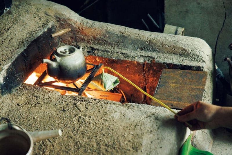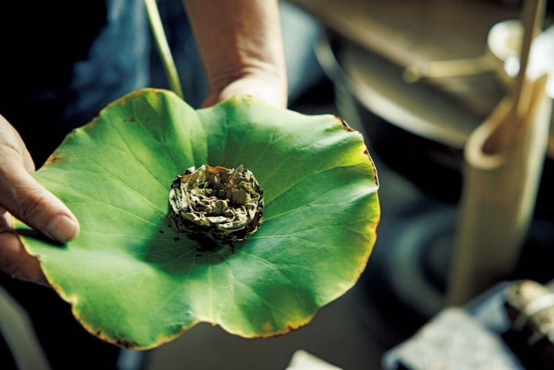 チベットの市場で手に入れた、人々の暮らしと共にある茶葉は、蓮の葉で包み、薪火で炙って香りを纏わせるアレンジを。蓮の葉は庭で育てている。