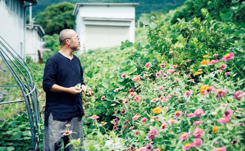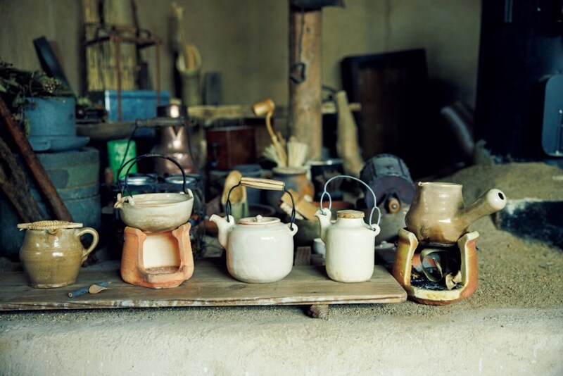 滋賀県・伊吹山の麓にある市川さんの工房には、少しずつ仕立ての異なる土瓶、さまざまな形の煮茶器、茶杯、片口などの茶道具が所狭しと並ぶ。灯油窯や電気窯、山の窯場にある薪窯など4つの窯を使い分け作られたものだ。工房はゲストを迎える場であり、茶はもてなしの中心にある。茶葉は旅先で手に入れたものや頂き物などさまざま。そこに加わるのが工房を囲むようにある庭や畑で育てた植物、野山で手に入れた野草だ。 「伊吹山は古来、薬草の宝庫として知られた地。茶を淹れるようになるまで意識したことはなかったけれど、今では宝物だらけに思えて」と市川さん。この日も、水を汲む帰り道で見つけた葛の花やカキドオシに顔をほころばせる。
