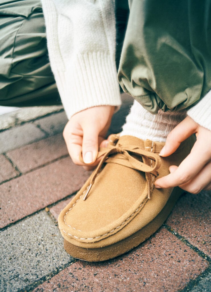 誕生からおよそ60年が経つ〈クラークス〉の「ワラビー」。シューズのトレンドが目まぐるしく変わりゆくなかでも、クッション性の高いクレープソールと一枚革のアッパーとを組み合わせたシンプルな一足は、いつだってワードローブの必需品。ワラビーのおなかの袋のように心地よく足を包みこむことからその名がついたとあって、歩き疲れしにくい。¥26,400(クラークスジャパン 03−6628−8417) ニット¥58,300(ポロ ラルフ ローレン/ラルフ ローレン 0120−3274−20) パンツ¥42,900(ヤエカ/ヤエカ アパートメント ストア 03−5708−5586) その他スタイリスト私物