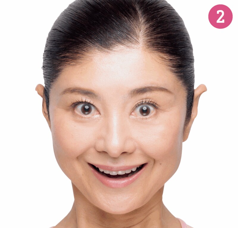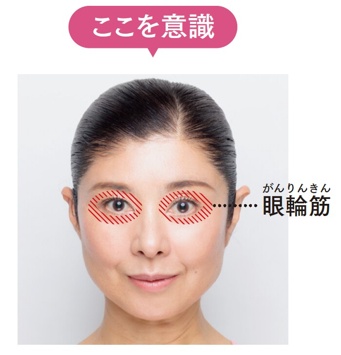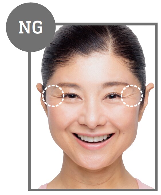 目を開けたまま笑顔をキープするとき、上の歯が8本見えるくらい頬を上げても目元にシワが寄らない状態がベスト!