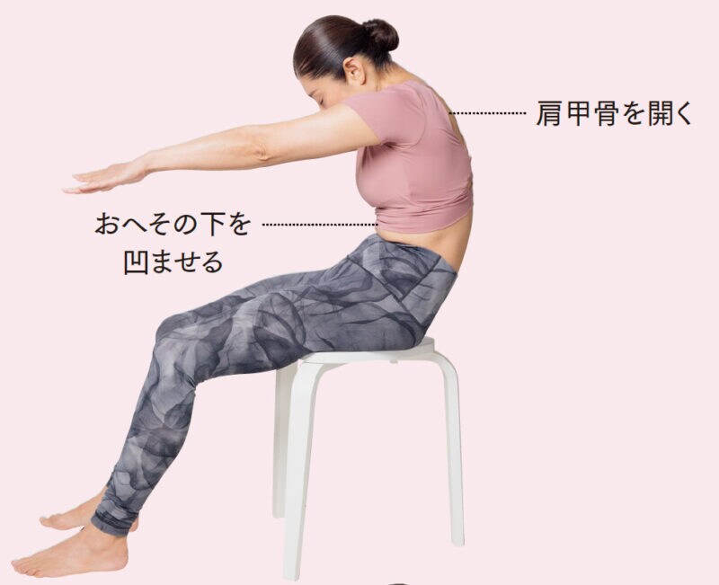 両手を前にのばし、背中を丸めるようにして骨盤を後ろに倒します。