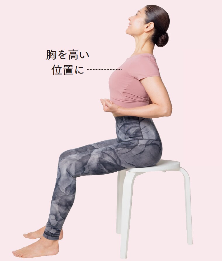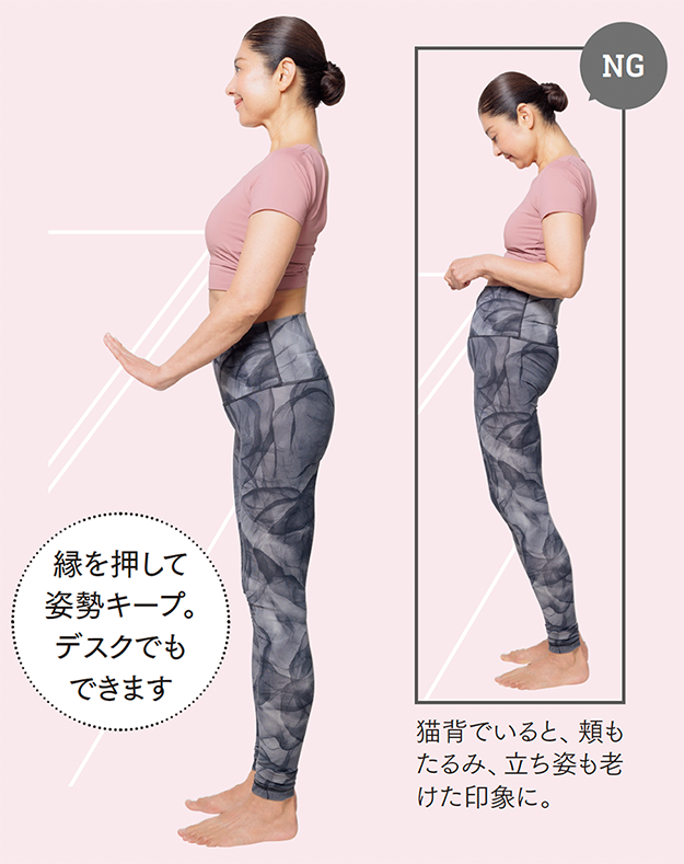 姿勢が歪んでいると顔も歪んでくるので、日頃から何気ないときでもコアフェイスを意識して。頬と口角を上げながら正しい姿勢をキープしましょう。