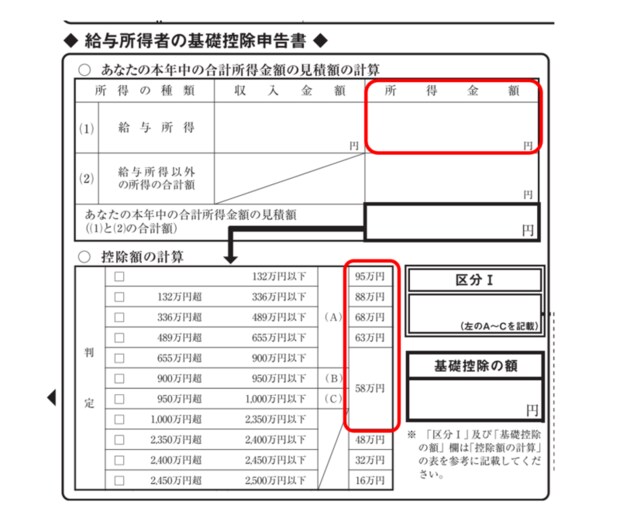 給与収入から給与所得金額を計算する方法はこれまでと同じです。年末調整の書類の裏面にある、給与所得の金額の計算表を参考に所得を計算し、その所得によって基礎控除の額が変わります。例えば所得が132万円以下となる場合、区分は(A)に該当し、基礎控除の額に「95万円」と記入することになります。