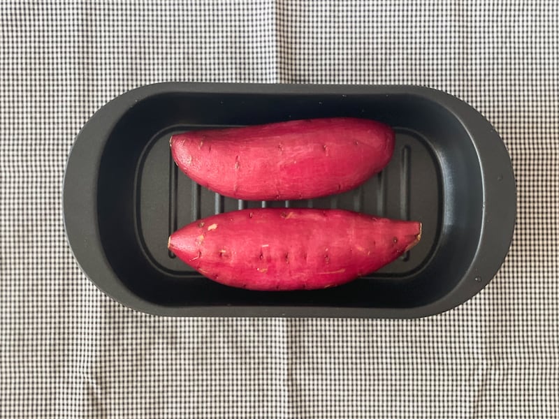 1.しっかり水洗いしたさつまいもを濡れたまま「未来型ロースター」に2つ並べます。