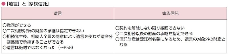 家族信託と遺言は、一般的には図表5のような相違点があります。遺言の場合、財産の名義はご本人ですが、家族信託では受託者になる点が大きな違いです。