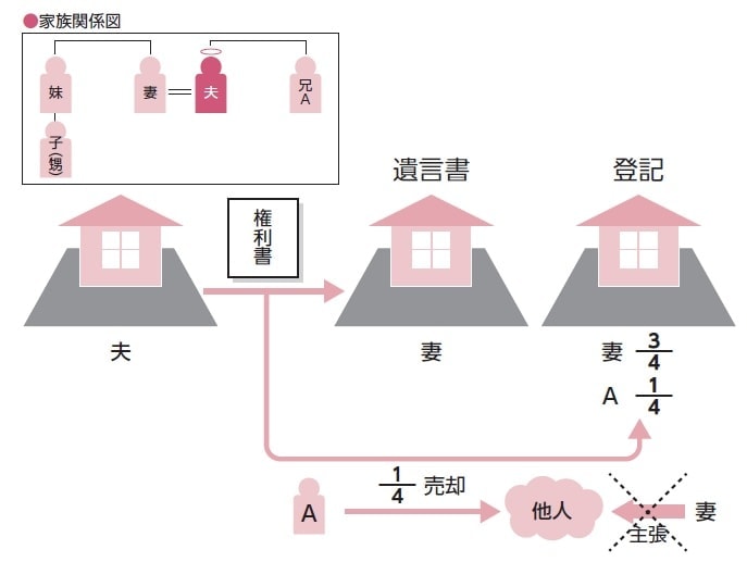 ご主人が亡くなった後、ご兄弟のAさんが、法定相続分による相続登記をした後、他人に自分の持分を売却してしまった場合、持分を買った他人は、権利を妻に主張できるでしょうか。