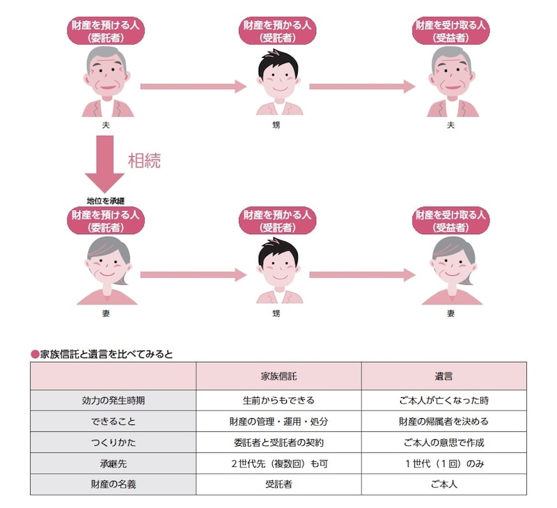 遺言がある場合、相続が発生したら、相続登記を速やかに行うことが重要ですが、他に解決方法はないものでしょうか。その場合、「家族信託」が解決に役立ちます。家族信託では、信託契約により信託財産となったご主人の財産は、受託者の名義に変わりますので、民法上の相続財産から除外されます。