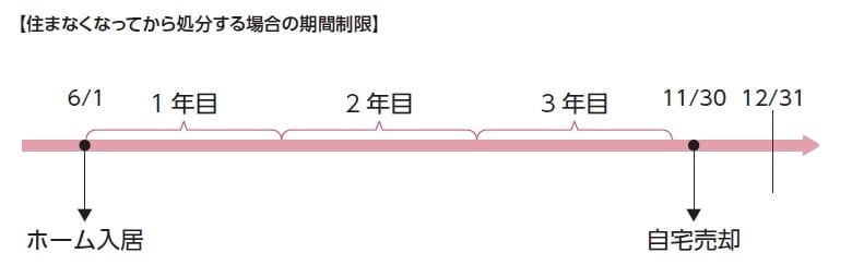 6月1日にホームへ入居し、3年後の年の11月に自宅を売却した場合、この特例を受けることができます。