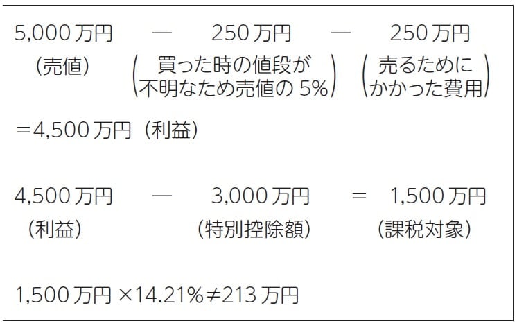 この特例は、売却によって利益がでたときは、その利益から3000万円の特別控除額を差し引いて所得税と住民税を計算します。