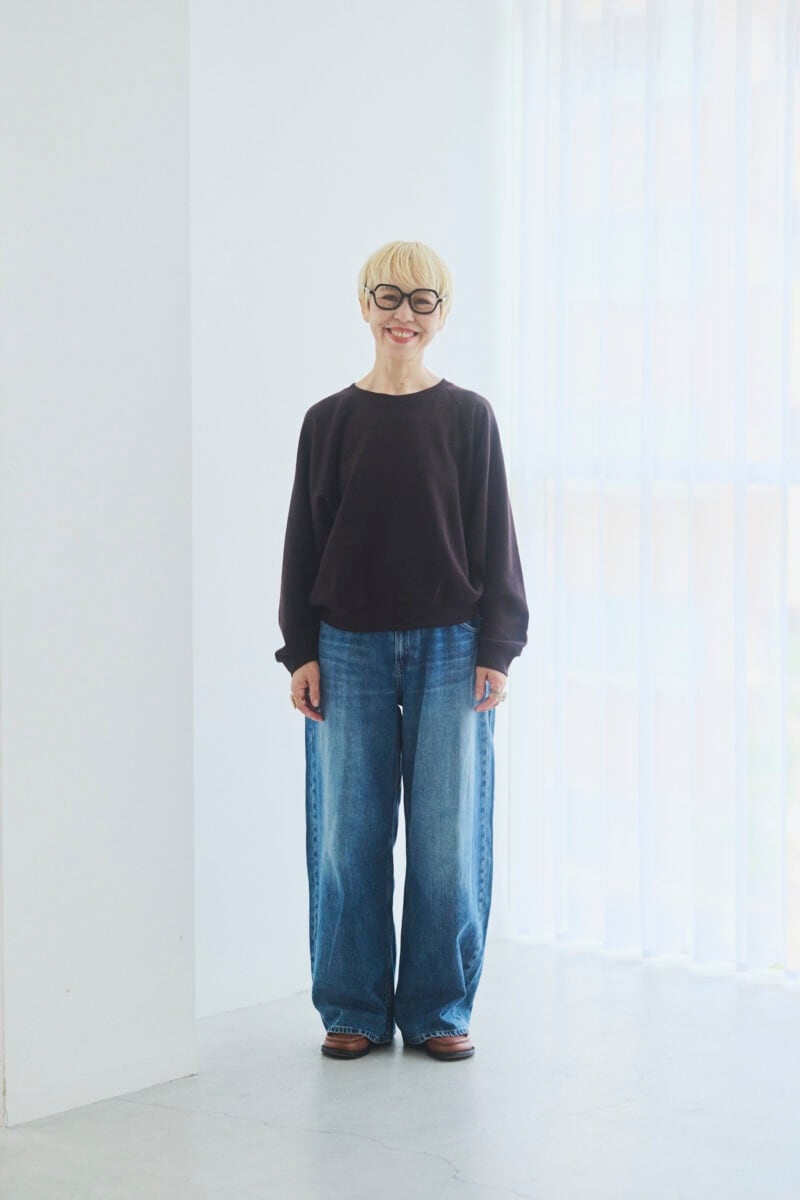 大人でも着こなしやすいワイドなデニムに、クルーネックのシンプルなスウェットというシンプルなコーデ。大切なのはサイズ選びです。「ユニクロはサイズバリエーションが豊富なのが特徴。『自分はMサイズ』などの思い込みを捨てて、複数サイズを試着してみるのがおすすめです。上下のバランスでも、似合うサイズは変わりますよ」。これだけだと、ややワンマイル感があるので、アイテムを足して変化させます。