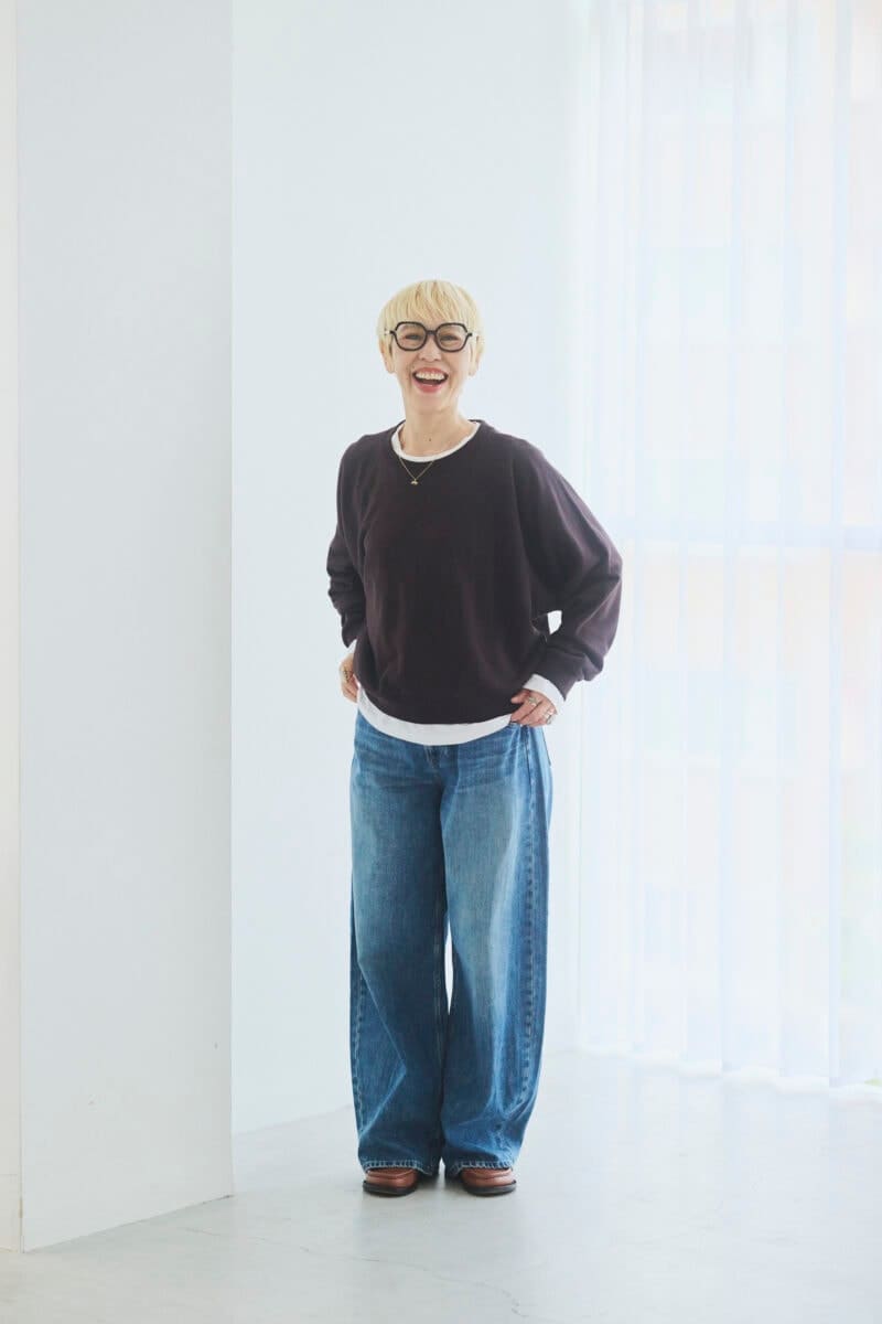 大人でも着こなしやすいワイドなデニムに、クルーネックのシンプルなスウェットというシンプルなコーデ。大切なのはサイズ選びです。「ユニクロはサイズバリエーションが豊富なのが特徴。『自分はMサイズ』などの思い込みを捨てて、複数サイズを試着してみるのがおすすめです。上下のバランスでも、似合うサイズは変わりますよ」。これだけだと、ややワンマイル感があるので、アイテムを足して変化させます。