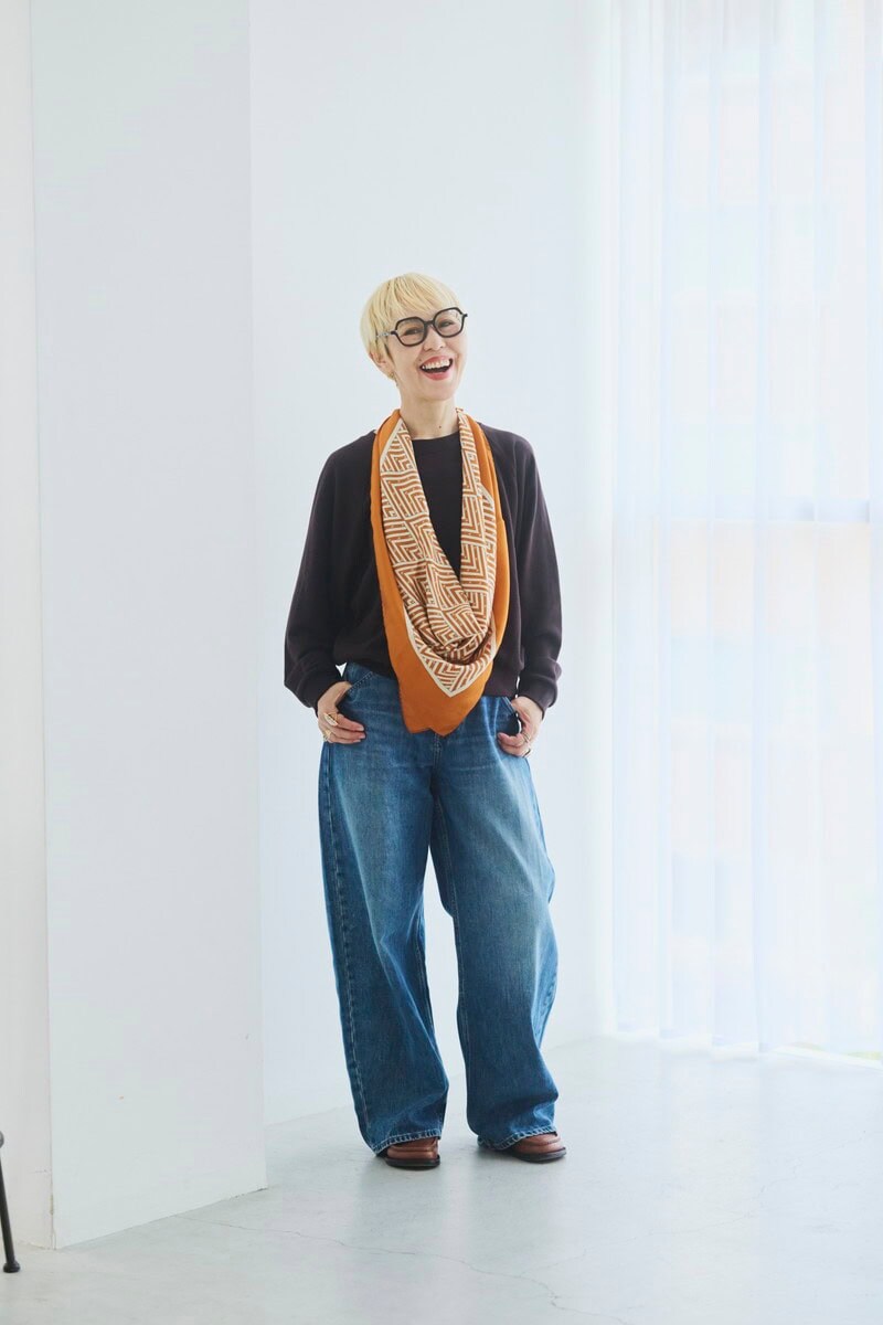 「大判スカーフはいただきものもあったりして、持っている人が多いのでは? 巻き方はむずかしく考える必要はナシ。実は首にかけるだけでも、簡単にイメージチェンジできるんです」。トップスがシンプルなほど、スカーフづかいでおしゃれに見える、おすすめのアレンジです。
