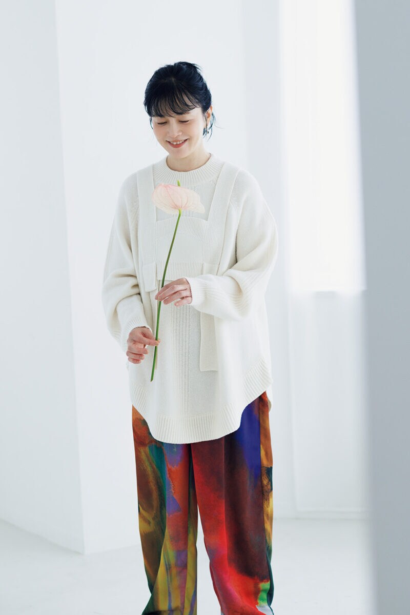 坂井さん着用:ニット¥42,900 /エンフォルド、パンツ¥31,900 /OMMO、ピアス¥88,000 /イヴェット