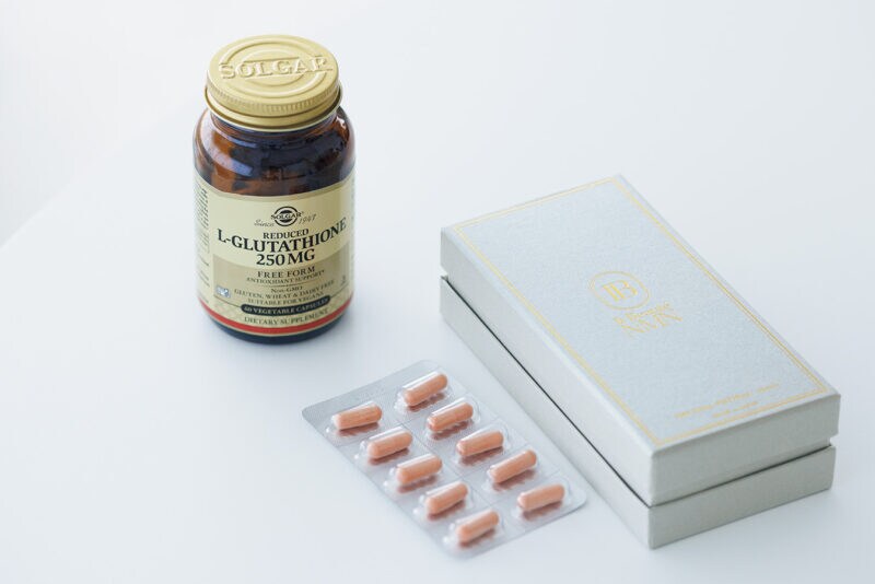肌と健康維持のために、抗酸化作用や肝臓に良いと言われるグルタチオンと、イットボーテの体の調子を整えるNMNを(坂井さん私物)。