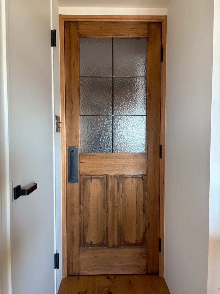 サイズ、形、ドアノブ、ヴィンテージ加工のレベルなど、迷いに迷いに、また迷いを重ね、やっと完成したリビングの仕切りのドア。