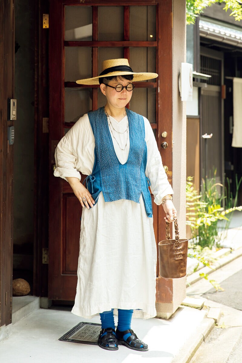 「ミッタン」の大麻ワンピースに重ねたのは「居相」のベスト。どちらも世界が注目する京都ブランド。