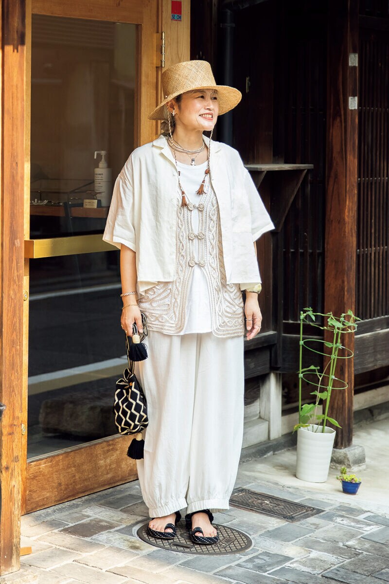 大人世代のフォークロアスタイルは、控えめな色数、アクセサリーの重ねづけ、小物使いが決め手。京都市内は自転車移動の人が多いので、帽子にはストラップが必須!