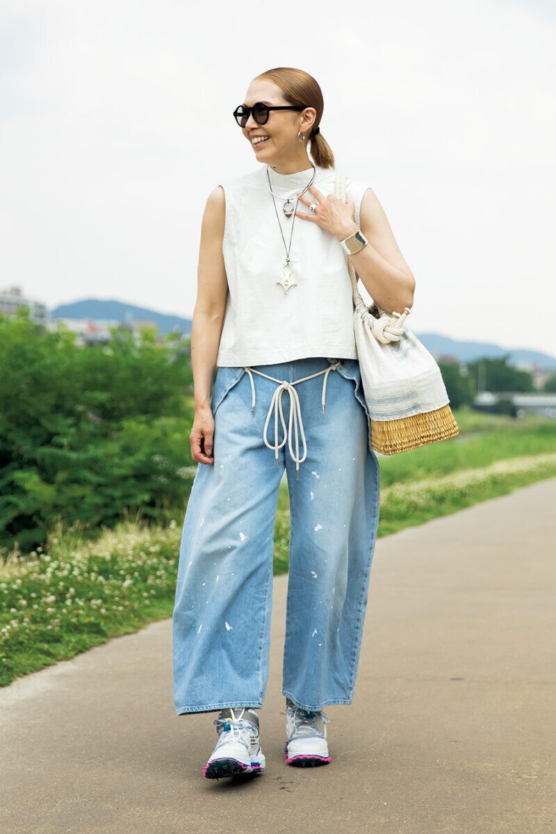 個性的な「メゾン マルタンマルジェラ」のラップデニムに、白トップスをさらりと合わせて。シルバーアクセの重ねづけもお手本にしたい、ナチュラルとモードの合わせ技。