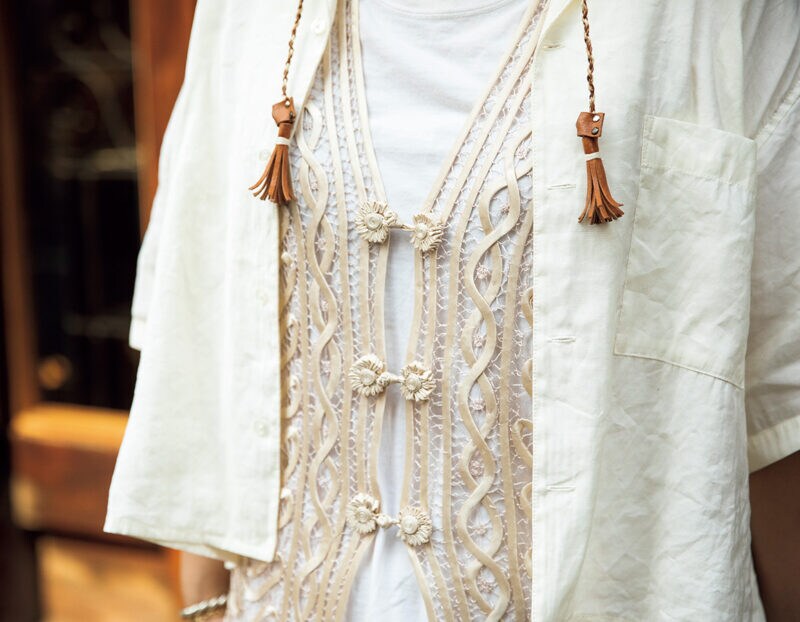 涼やかさを引き立ててくれるレースのベストは「トゥデイフル」のもの。