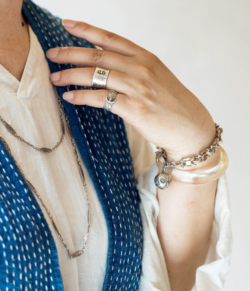 アンティークのネックレスとブレスレットに、京都の「ウスカバード」のリングを合わせて。