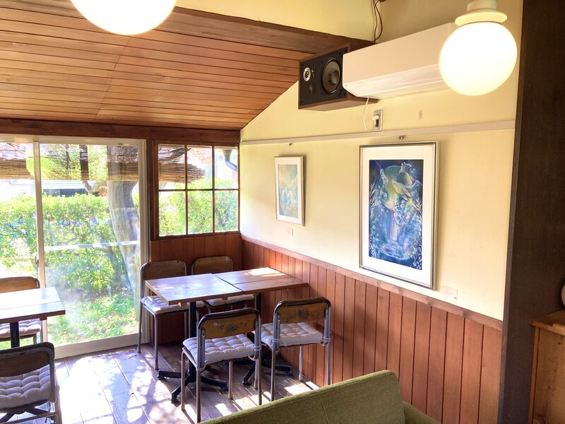 その古民家風の建物の店内は、山小屋のようなウッディーな空間にテーブル席が7席ほどあって、靴を脱いでスリッパでテーブルに就きます。こちらの席でランチプレートを頂きました。