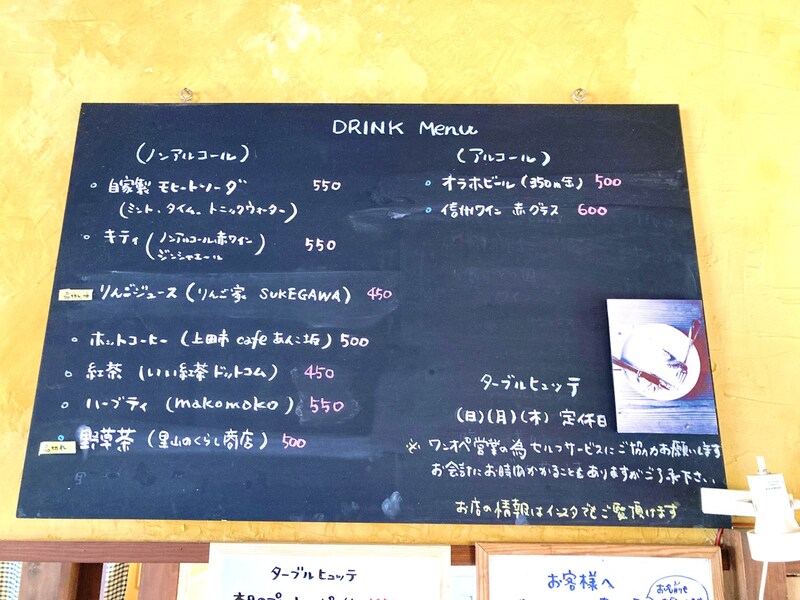 ターブルヒュッテのオーナーシェフ中嶋さんは、ルヴァン富ヶ谷で修業の後ルヴァン上田の立ち上げに参加され、2010年に東御市滋野に「ローカルベンチ」をオープンされました。その後2019年11月に現在の「ターブルヒュッテ」に改名して、同時にカフェスペースもできました。