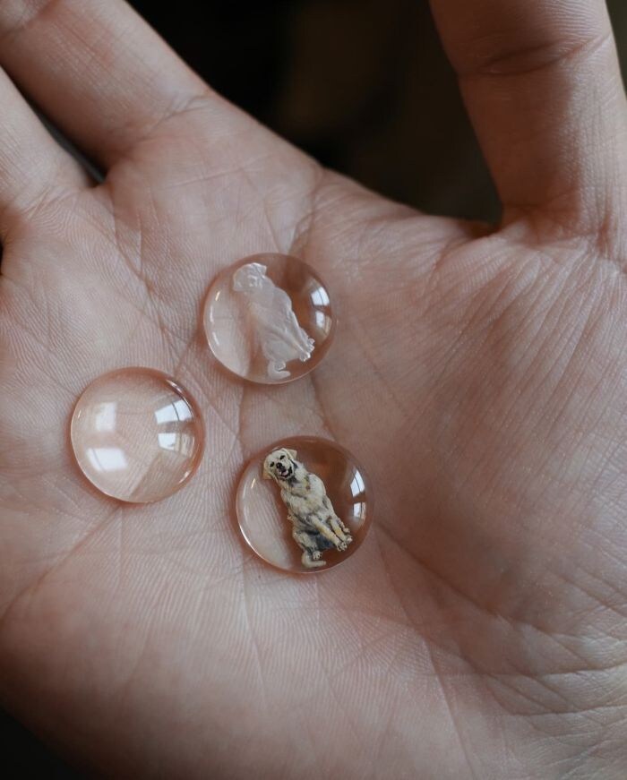 「Being Furry」では裏にちみつなペットのペイントを施したヴィンテージのクリスタルをリングにしたり、ネックレスにしたり、様々なバリエーションでオーダーが可能。2回目となる今回は、クリスタルの周りに脇石を配さないデザインや、背景にストライプやドットの模様を施したスタイル、シトリンなどのストーンの背面を彫刻することでペットの姿を再現する新たなデザインが仲間入り。