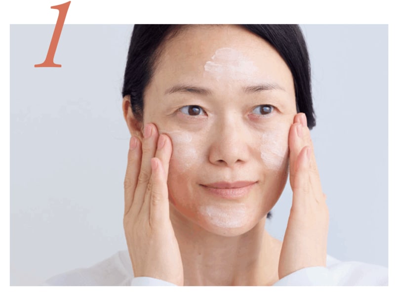 適量を指に出し、左右の指の腹を合わせて練り広げたら、額、両頬、あごに乗せてから、軽くトントンと広げていく。