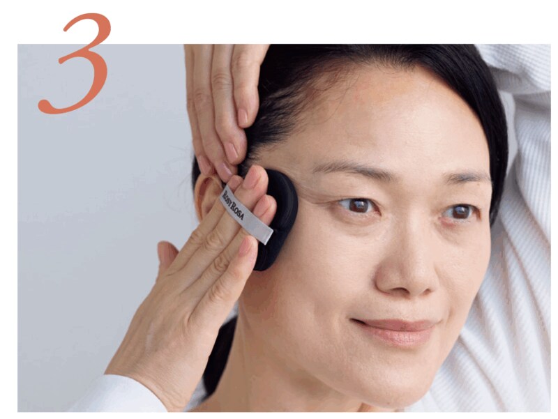 仕上げに頬を軽く引き上げ、パフで下から上へタッピングすると、たるみ毛穴もカバー。
