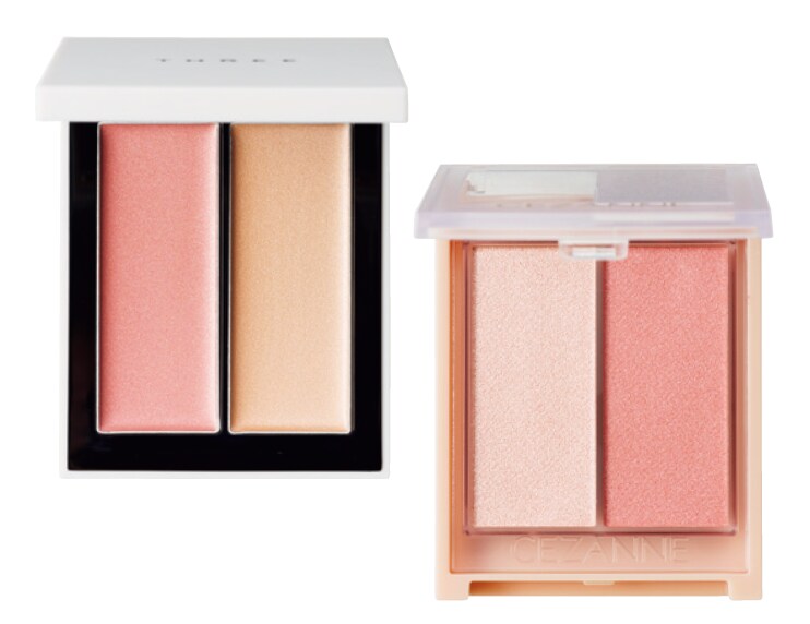 (左)多幸感あふれる濃淡ピンク。肌にのせるとさらっとした質感に。THREE シマリング グロー デュオ R X01 ¥4,950(10月29日限定発売)/THREE