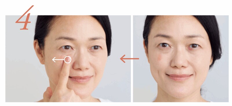 そこを支点に指1本分内側にもおき、頬の丸みの終点まで真横へなじませる。