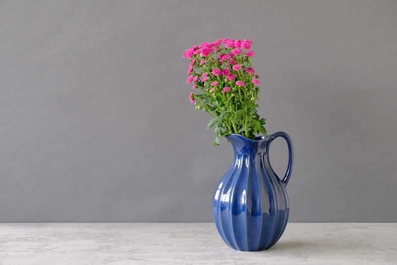 小さなポンポン咲きが可愛らしい「カリメロ」というスプレーマムを、ネイビーの水差しにざっくりと投げ入れました。