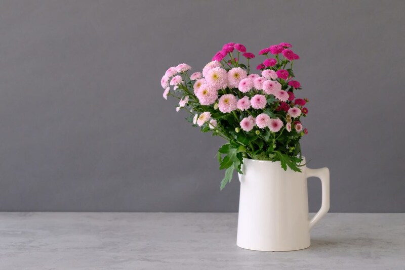 白い陶器の水差しには、ピンクの濃淡の「カリメロ」と「ドリア ピンク」、3種類のスプレーマムを生けました。