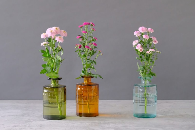 スプレーマムは一本でもボリューム感がありますが、一輪挿しを集めると、とても華やかに変化します。