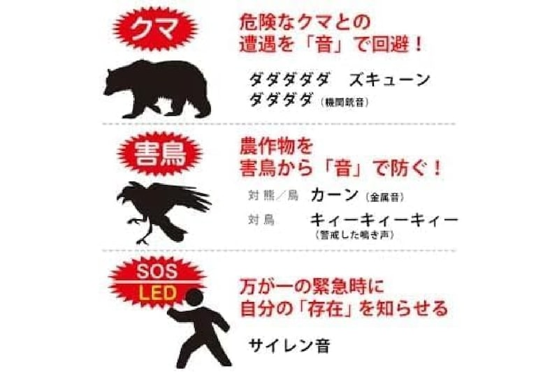 携帯ホーンは、熊やイノシシなどの野生動物対策だけでなく、農作物を荒らす鳥獣よけ、防犯ブザー、緊急時のSOSアラームとして使える多機能アイテムです。